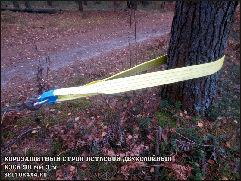 Стропа корозащитная изготовлена из прочной полиэфирной ленты шириной 90 мм с разрывной нагрузкой ~13,5 т. Прошита в два слоя. Петли защищены от истирания протекторной лентой. Длина 3 м, вес ~1,4 кг. Предназначена для защиты коры и ствола дерева от повреждений лебедочным тросом при эвакуации застрявшего автомобиля.
